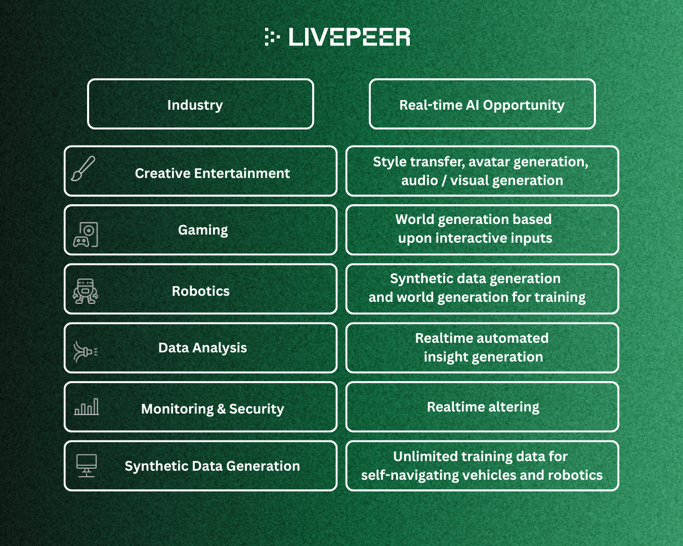 World models are a game changing category, and Livepeer is well suited to offer a unique and differentiated product here, that serves a huge market of diverse and varying use cases. These range from creative entertainment, to gaming, to robotics, to data analysis, to monitoring and security, to synthetic data generation for AGI itself.